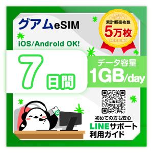 グアムeSIM:使用日数:7日間/データ容量:1GB(day)/簡単設定/有効期限90日/最短即日発行/パスポート番号不要/データ通信専用