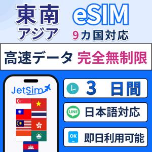 【東南アジア9カ国 eSIM】3日間 高速データ無制限 シンガポール・香港・タイ・インドネシア・マレーシア・ベトナム含む 即日発行 テザリング可