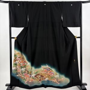 黒留袖 身丈162.5cm 裄丈65.5cm M 袷 松井青々 落款あり 扇面 松竹梅 金彩 金糸 黒 正絹 名品 中古
