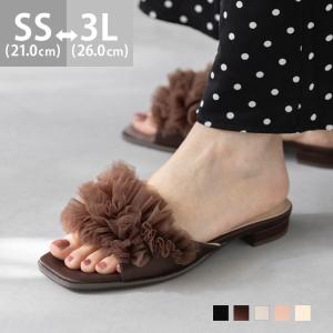 サンダル レディース 浴衣 ローヒール 痛くない 歩きやすい スクエアトゥ フリル チュール ミュール つっかけ スリッパ 送料無料