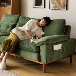CAGUUU ウッドフレーム本革グリーンクッションソファ L180*W97*H79cm 本革 リビングソファ 木製フレーム チェリー材使用 座面65cm深さ