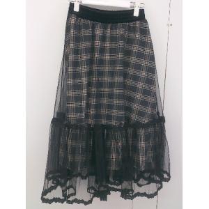 ◇ DHOLIC ウエストゴム チェック ロング フレア チュール スカート ブラック ホワイト マルチ レディース