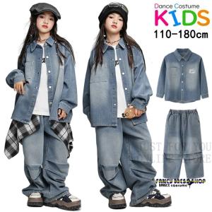 ブルー デニムシャツ 長袖 キッズ ダンス衣装 セットアップ 上下セット ステージ衣装 韓国 k-pop おしゃれ 女の子 男の子 子供 かっこいい かわいい ゆったり ジ