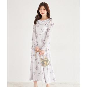 ワンピース バックレースアップドレープネックフラワープリントベロアワンピース