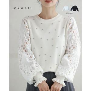 カワイイ CAWAII 孔雀羽レース袖のビジューニットプルオーバートップス (ホワイト)