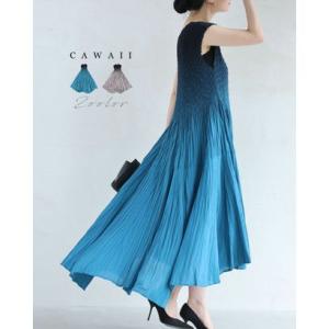 カワイイ CAWAII 染まりゆくグラデーションのランダム裾プリーツロングワンピース (ブルー)