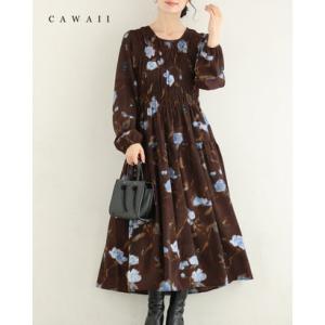 カワイイ CAWAII 淡いブルーの花が降る胸元シャーリングミディアムワンピース (ブラウン)