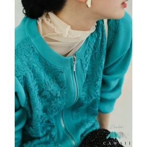 カワイイ CAWAII オーガンジーに咲く花刺繍のリブニットブルゾン (グリーン)