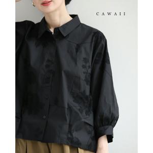 カワイイ CAWAII スクエアシルエットの花刺繍タックシャツトップス (ブラック)