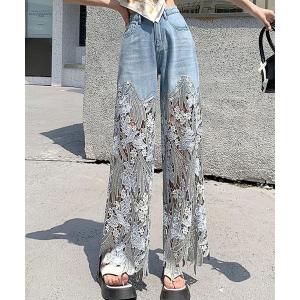 ジーンズ デニム デニムパンツ レース切替デニムワイドパンツ レディース