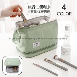 化粧ポーチ コスメポーチ メイクポーチ 化粧品収納 レディース 女性 大容量 2重構造 防水 ファスナー 英字 ロゴ ブラック かわいい おしゃれ シ