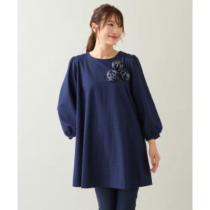 ブラウス シャツ 「伸縮性」巻きバラニットデニムチュニック レディース