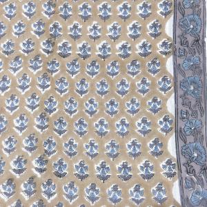 【50cm単位】サンドベージュくすみブルースモールフラワー 片耳ボーダー付き インド ハンドブロックプリント生地 テキスタイル コットン