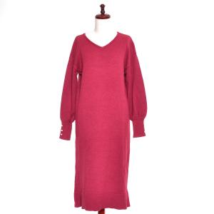 □492026 HUSHUSH ハッシュアッシュ ロングワンピース ○パール調スリーブニットOP パフスリーブ Vネック サイズM レディース ボルドー