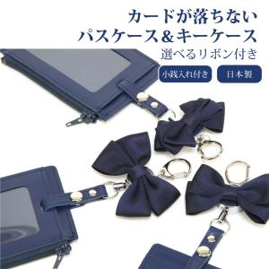 ポスト投函送料無料 完全日本製 カードやパスが落ちない 選べるリボン 本革製 リール付きパスケース 紺色無地 カードケース 小銭入れ付き 子供用 定期入れ