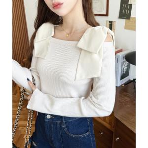 ニット セーター リボンストラップ2WAYオフショルニットトップス レディース