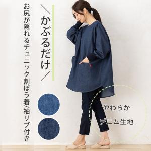 割烹着 ゆったり かっぽう着 かぶるだけ かぶり おしゃれ スモック 大人 保育士 袖リブ 柔らかデニムチュニック割烹着 45500 M-L かわいい お尻が隠れる 母の日