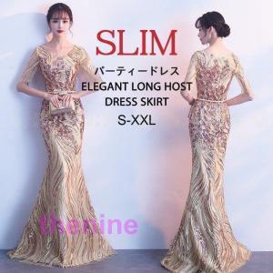 パーティードレス マーメイド イブニングドレス 五分袖 袖あり 忘年会 結婚式 キレイめ ゴールド 演奏会 マキシドレス スパンコール キラキラ