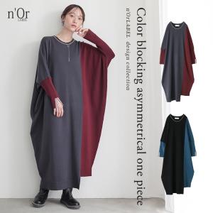 ワンピース ニットワンピース ロング 長袖 レディース アシンメトリー 配色 ゆったり 着痩せ ドルマン 体型カバー 秋 冬「メール便不可」「30」