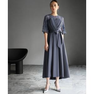 ドレス 「低身長対応」レース切替えビスチェ風イレギュラーヘム フレア ロング 結婚式 ワンピース パーティードレス オケージョンドレス お呼ばれ 二次