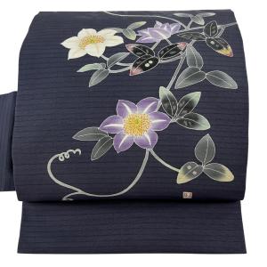 名古屋帯 逸品 羽田登喜 落款あり 夏帯 絽 草花 青灰色 正絹 中古