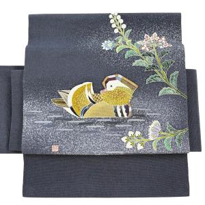美品 付け帯 逸品 人間国宝 羽田登喜男 落款あり 作り帯 鴛鴦 草花 金銀彩 縮緬 濃紺 正絹 中古
