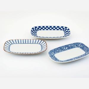 美濃焼 藍屋 多用皿トリオ 21×21×4cm 十草・市松・唐草 家庭用食洗機使用 取り寄せ商品