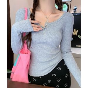 tシャツ 「人気新色登場入荷済!今すぐチェック!」韓国風リブカットソー 長袖トップス/ヘンリーネック&ボタンデザイン レディース