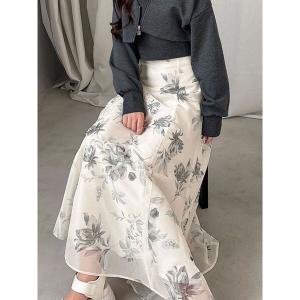スカート フロッキープリントフレアスカート