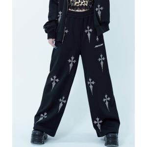 スウェットパンツ ジャージ 「REFLEM/レフレム」クロス総柄ラインストーンスウェットワイドパンツ レディース メンズ