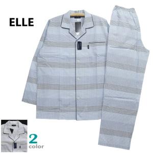 パジャマ Lサイズ メンズ 春夏 紳士 長袖 長ズボン ELLE エル 綿100% 先染サッカー地 テーラー襟 前あき 紳士 ナイトウエア