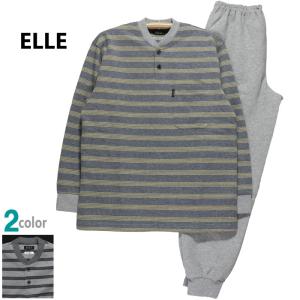 Mサイズ メンズ パジャマ 秋冬 長袖 長ズボン ELLE 綿100% 先染スムースニット スタンドカラー 前あき