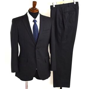 美品 Kintetsu 2つボタン シングルスーツ S A4 ダークネイビー ストライプ ノータック 開き見せ 34614-20C8424 合物 春秋 6XB031